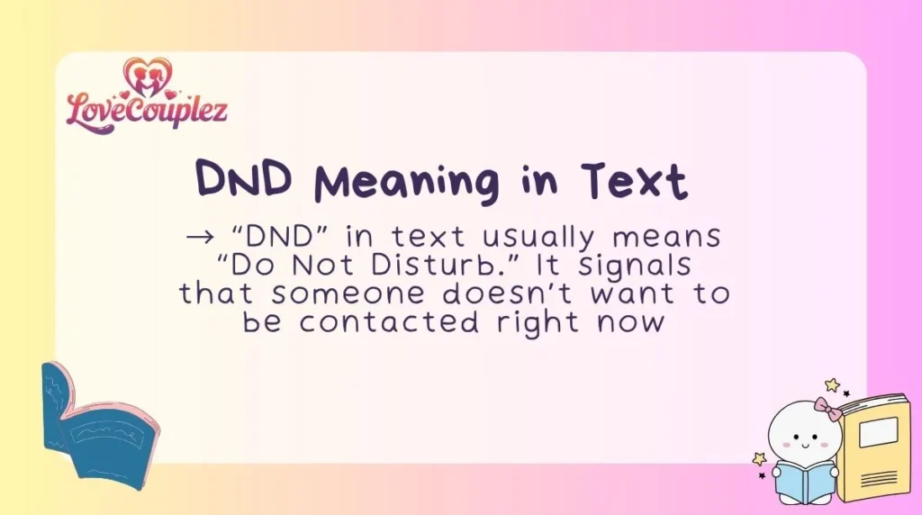→ “DND” in text usually means “Do Not Disturb.” It signals that someone doesn’t want to be contacted right now. It can be serious (busy, sleeping) or casual (just ignoring messages temporarily). Context decides the tone, especially in social and gaming conversations.