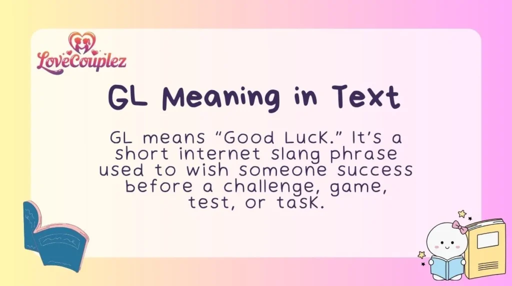 GL means “Good Luck.” It’s a short internet slang phrase used to wish someone success before a challenge, game, test, or task. The abbreviation appears commonly in gaming chats, social media comments, and text messages as a fast way to show support or encouragement.