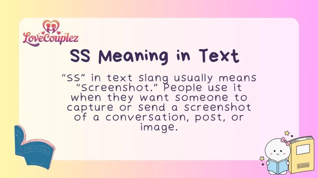 → “SS” in text slang usually means “Screenshot.” People use it when they want someone to capture or send a screenshot of a conversation, post, or image. In some contexts it can also mean “Same Same,” “So Sweet,” or other meanings depending on the conversation.